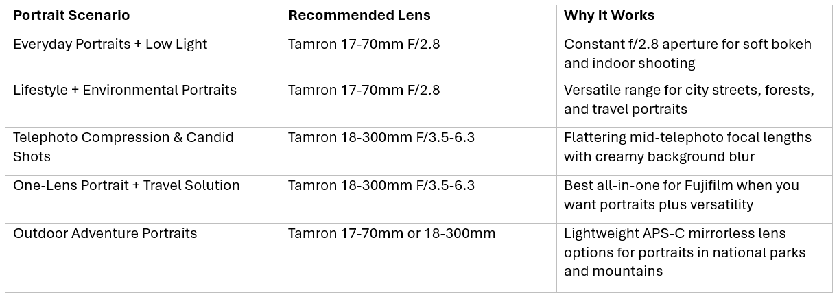 - ¿Qué lente Tamron Fujifilm es la adecuada para tu estilo de retrato y entorno de fotografía, desde sesiones de estudio hasta retratos de aventura al aire libre en exteriores, incluyendo bodas, eventos y sesiones de retratos con luz natural?.