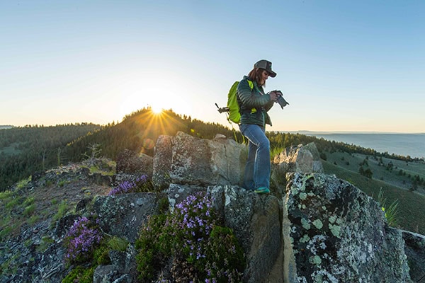 La mujer de la foto es Annette Pitts, directora ejecutiva del Cascade Loop. Su trabajo consiste básicamente en vivir en el circuito. Viaja por él cuatro o cinco veces al mes, conectando por el camino con todos los miembros del circuito. La idea era que le hiciéramos algunas fotos fotografiando, ya que ahora está aprendiendo más sobre fotografía. Queríamos un retrato de ella sobre el terreno; es una foto que ahora utiliza en folletos y otros materiales de marketing, ya que la fotografía es un gran atractivo para viajar por el Cascade Loop.