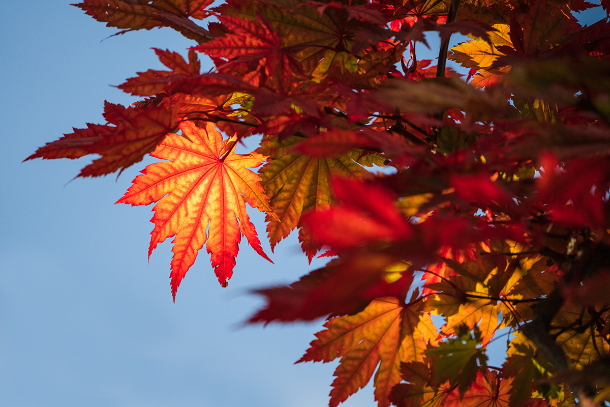 Ponte debajo de una flor o un árbol, o encima de ellos, o acércate desde un lado. Me encanta la luz cálida, por eso suelo salir a hacer fotos durante la hora dorada, y por eso intento añadir aún más calidez a mis fotos como puedo. Eso es lo que me pasó cuando estaba debajo de estas hojas otoñales, donde la luz iluminaba esa hoja tan maravillosamente. Estaba resplandeciente.