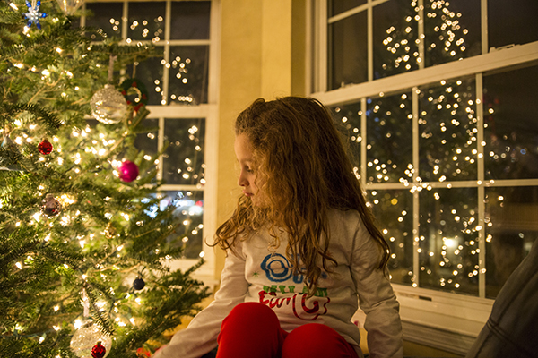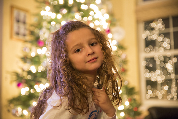 4- ¡Mantén la nitidez! Nadie quiere una postal borrosa. Admitámoslo. Los niños no se quedan quietos. Al menos los míos no. Usted quiere asegurarse de que su velocidad de obturación es lo suficientemente rápido, pero también que tiene suficiente luz para que su ISO está en un ajuste razonable. Esto no es un problema en exteriores o durante el día, pero cuando se dispara en situaciones de poca luz puede ser un reto. Para estas imágenes, acabábamos de terminar de decorar nuestro árbol y me inspiré en todos los destellos que veía en la habitación. Me encanta el hermoso bokeh creado por el reflejo de las luces en mi ventana y en el árbol de Navidad detrás de mi hija. Estas fotos fueron capturadas con el nuevo objetivo SP 24-70mm G2 e incluso con el obturador ajustado a 1/15 de segundo pude capturar a mi hija sin ningún desenfoque. Se lo atribuyo a la increíble función de compensación de la vibración (VC) del objetivo.