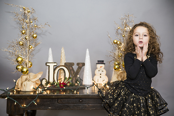 3- Haz un plan. ¿Qué quieres que diga tu tarjeta? ¿Qué sentimiento quieres transmitir? A veces es bueno echar un vistazo a distintos formatos de tarjeta para inspirarse y coger ideas sobre temas de color. Puedes utilizar algún accesorio festivo para completar la imagen, pero no te compliques. No querrás que las fotos parezcan demasiado recargadas. Haz que tu hijo sea el centro de atención. Para estas imágenes, coloqué un telón de fondo en el salón frente a la ventana para obtener luz natural, añadí algunos accesorios, elegí un atuendo que combinaba con el color del escenario y utilicé mi objetivo SP 24-70 mm F/2,8 de confianza.