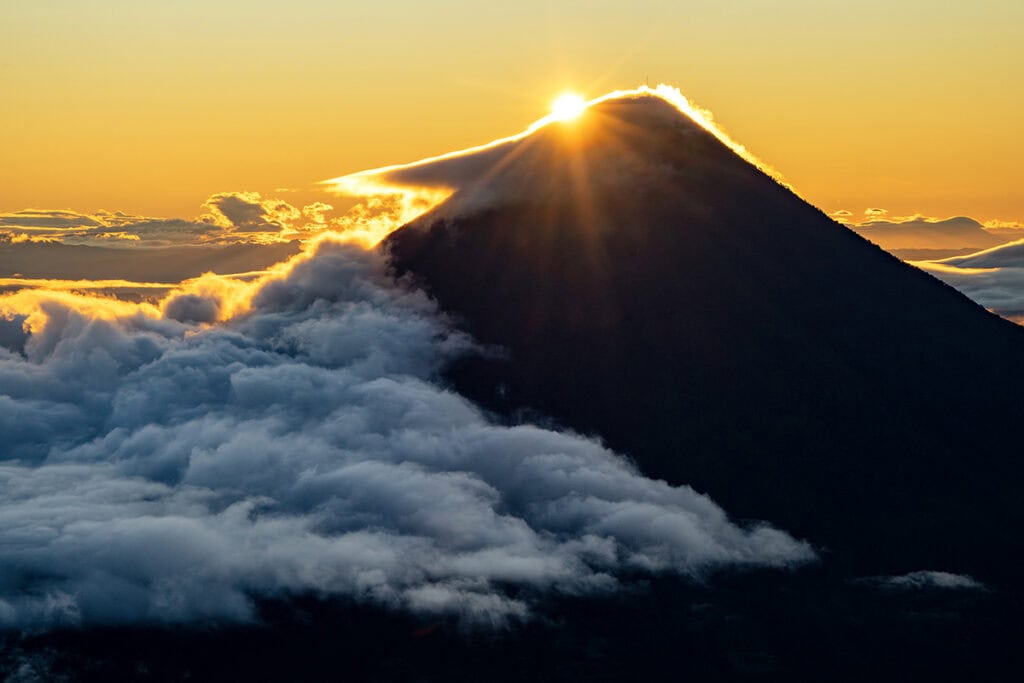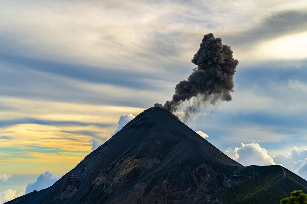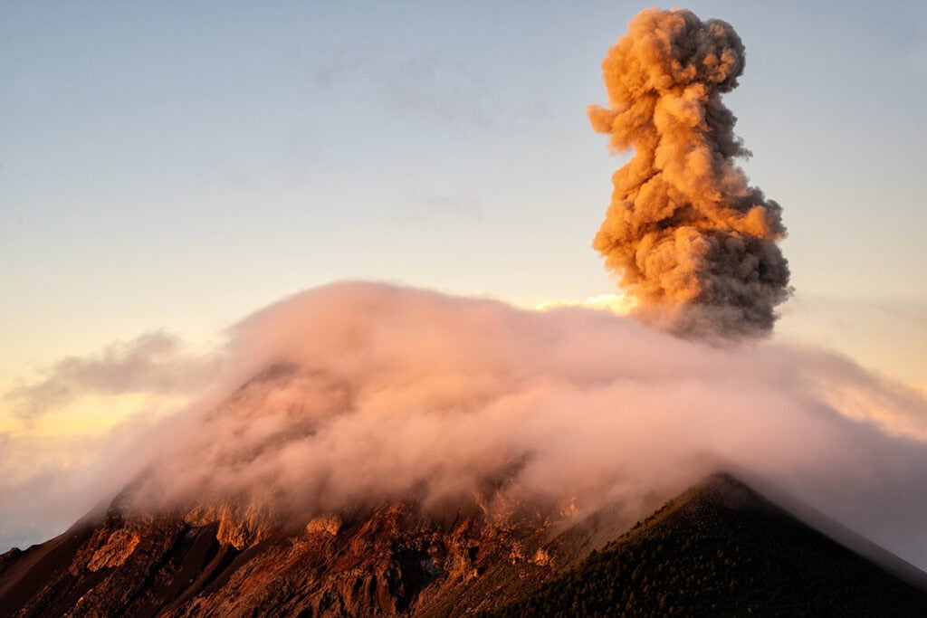 Incorporarlas puede aumentar significativamente el dramatismo visual de sus fotografías de volcanes. Esto es especialmente cierto en las primeras horas de la mañana: Puede que no consigas los contrastes tan intensos que se consiguen al atardecer, pero la niebla o la bruma matutinas que persisten en los valles o rodean el volcán pueden crear una atmósfera diferente y más misteriosa. La suave luz del amanecer o el atardecer también puede resaltar el humo, añadiendo profundidad y textura a tus tomas, mientras que oscurecer la cima del volcán puede añadir un elemento de intriga.