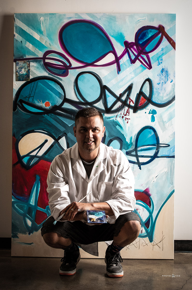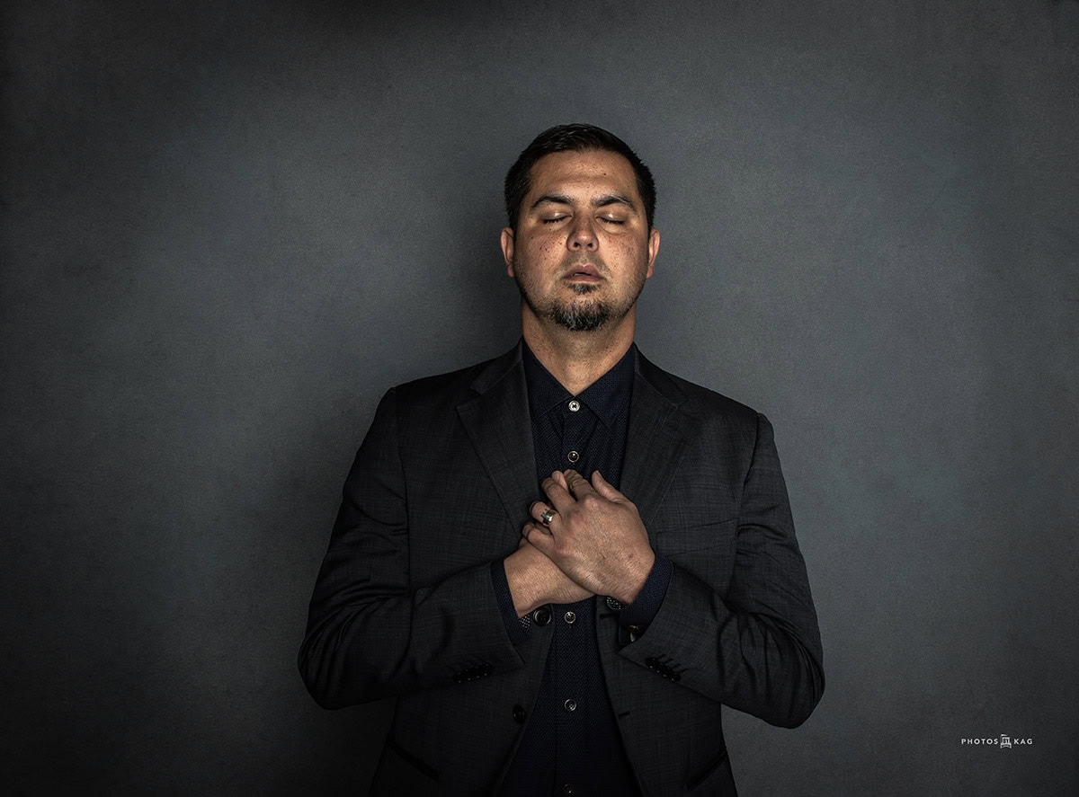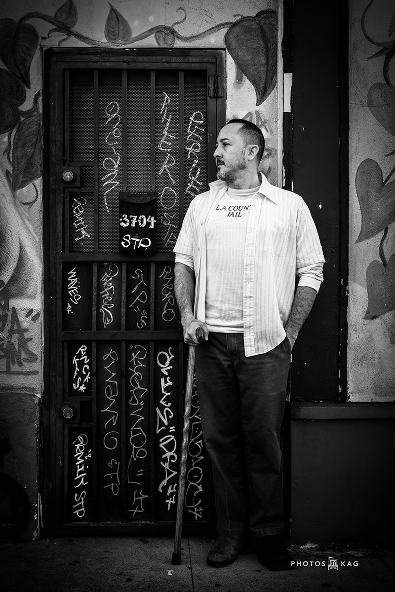 Por ejemplo, Rafael McMaster, un artista que dirige Indivisible Arts, una organización sin ánimo de lucro de la Resin Gallery de Hermosa Beach (California). "Rafael se puso sobrio hace seis años, y fue muy franco sobre sus experiencias en nuestras entrevistas", dice Kevin. "Llevaba una vida de ejecutivo creativo en la industria del entretenimiento y luego se estrelló. Pero encontró la sobriedad y la paz interior, y ahora medita tres veces al día. El día que le hice el retrato formal, era temprano por la mañana y me dijo: "¿Te importa si medito un poco antes de empezar? Le dije que lo hiciera, y mientras lo hacía, con los ojos cerrados, me di cuenta de que tenía que hacerle una foto. Era una toma tan convincente y tan parte de su arco narrativo". Rafael utiliza ahora la fotografía y el arte para cultivar la creatividad, la conciencia y la conexión.