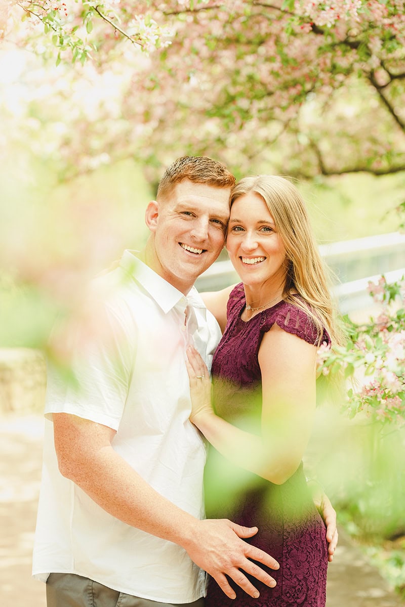 Busca fondos que no distraigan, eligiendo colores y elementos que complementen a la pareja y su entorno. No pases por alto la posibilidad de incorporar elementos en primer plano, como hice aquí con la pareja posando detrás de unas ramas. Al difuminar esos elementos del primer plano, pude añadir profundidad y crear capas en mi composición.
