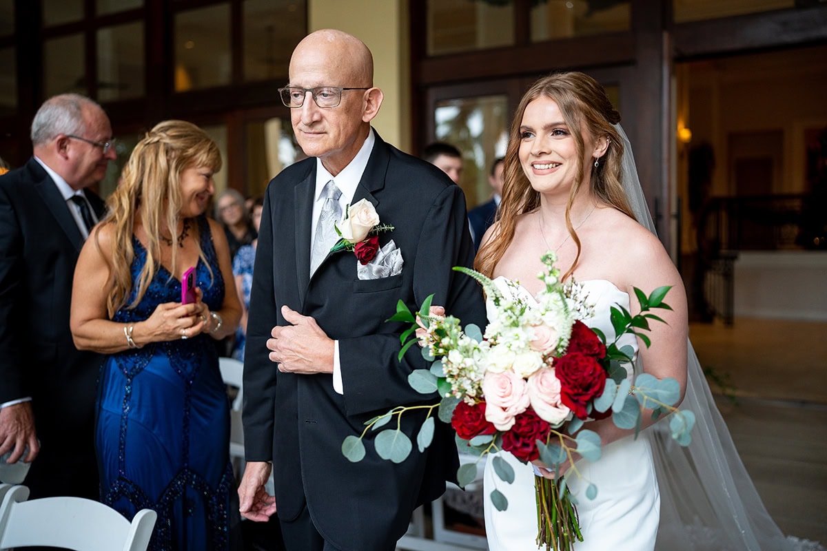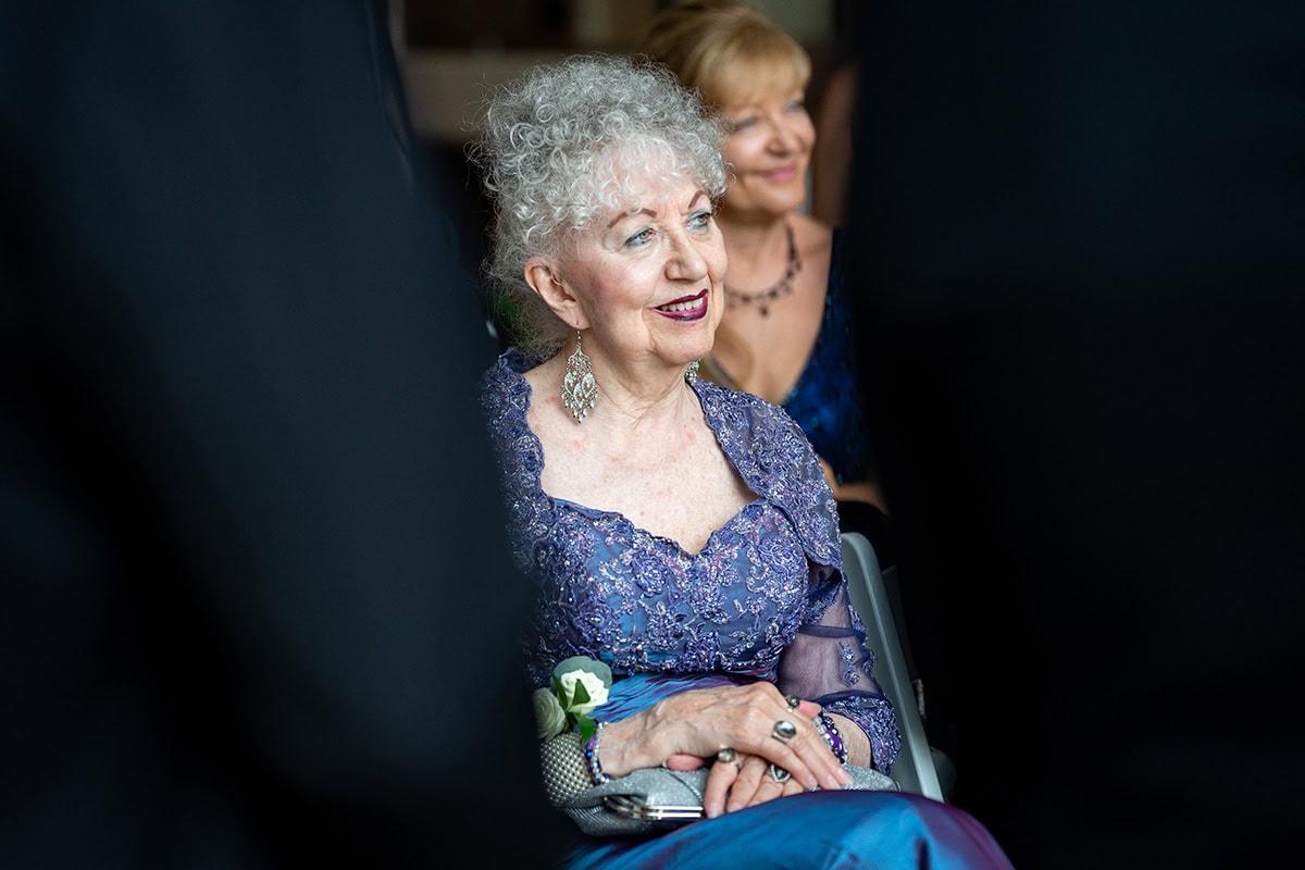 Cuando llega el momento de dirigirse a la ceremonia y la recepción, Scott se asegura de capturar las fotos que todos los recién casados suelen querer que acaben en sus álbumes: los pasos por el altar, los primeros bailes, el corte de la tarta. Pero también intenta buscar formas únicas de documentar a los seres queridos que vinieron a compartir el día especial de la pareja. "Para la foto que ves aquí de la elegante abuela en la ceremonia, sonriendo en su asiento, la vi por casualidad cuando caminaba detrás de dos padrinos", dice. "Me encanta añadir capas a fotos como ésta, con objetos en primer plano para que la imagen sea un poco más llamativa. Una vez más, esa es la belleza de ese objetivo 35-150. El hecho de que pueda ampliar cuando lo necesito y luego acercarme para tomas como esta hace que sea muy fácil utilizar un solo objetivo para toda la ceremonia."