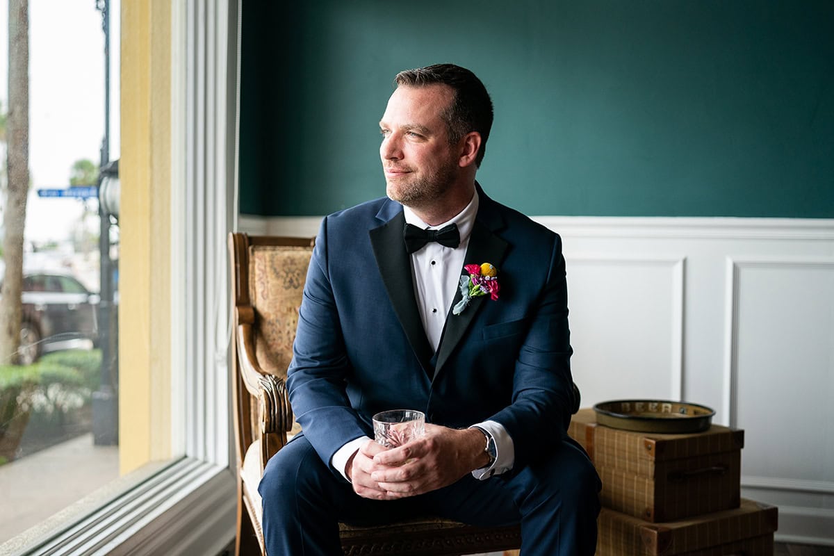Acordarse de incluir al novio en las fotos en solitario también está en la lista de tareas pendientes de Scott. "Los novios tienden a caer en el terreno de los olvidados, pero para ser sincero, muchos de ellos no quieren estar demasiado delante de la cámara de todos modos", dice. "Así que suelo tantear al novio para ver si está dispuesto a dedicarme más tiempo. Le alejo de sus padrinos, le pregunto si quiere tomar algo (sin dejarme llevar) y luego busco una buena iluminación para colocarle". En la foto que veis aquí, el local tenía grandes ventanales, así que acerqué una silla a uno de ellos, le hice sujetar su bebida e intenté que sonriera con algunas bromas".