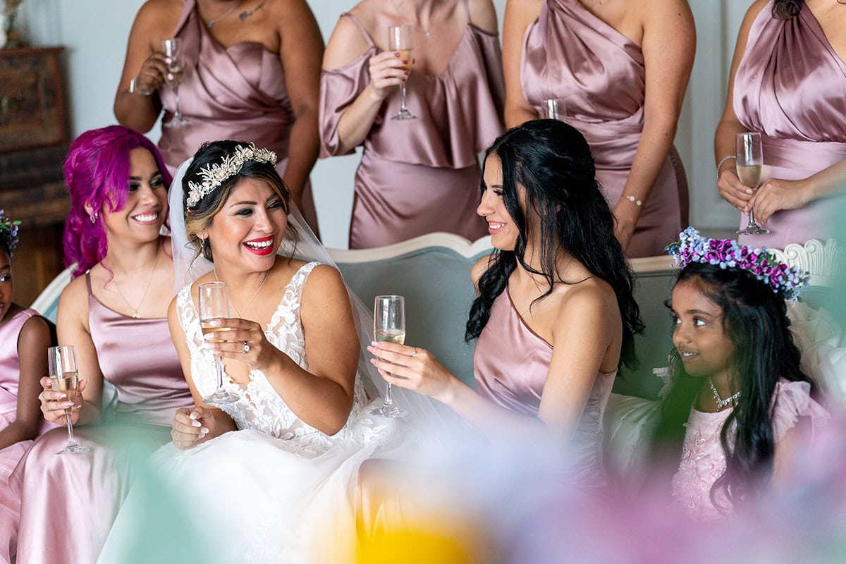 Al final, el éxito de una boda, desde la perspectiva de Scott, se debe a sus esfuerzos por mantener a todo el mundo relajado, cómodo y divirtiéndose. "En esa foto de la novia y las mujeres de su cortejo nupcial, había pedido a alguien que hiciera un brindis con champán, y nadie se pronunciaba", dice. "Así que cambié de marcha y dije: 'Vale, a la de tres, que todo el mundo diga '¡Yas reina! Así que conté y todos lo dijeron, y todo el mundo empezó a reírse. Excepto esa niña, que parece que está pensando: 'No estoy segura de lo que significa, no voy a decirlo'. Pero en cuanto a las fotos de grupo en general, cuanto más sueltos los tenga, más bajarán la guardia y serán ellos mismos conmigo. Es entonces cuando sé que voy a sacar unas fotos estupendas".