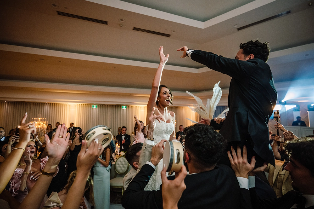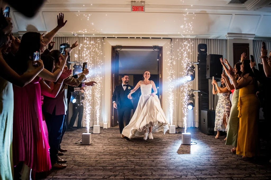 Le jour d'un mariage est riche en émotions, en moments significatifs et en surprises (parfois nombreuses) que personne n'avait prévues. Pendant la réception, je passe souvent à une focale plus large, comme la fidèle 28-75 mm, afin de capturer l'énergie de la salle et les différentes couches qui composent l'histoire. Un recadrage trop serré peut faire disparaître les éléments environnants qui ajoutent du contexte et de la profondeur. Et soyons honnêtes, de nos jours, tout le monde filment avec leurs téléphones. Alors, comme le dit le proverbe, si vous ne pouvez pas les battre... rejoignez-les ! En me penchant vers l'extrémité la plus large de l'objectif, je peux cadrer la réaction du couple et les applaudissements enthousiastes de leurs invités alors qu'ils font leur grande entrée : téléphones en l'air, sourires partout et beaucoup de magie en une seule photo.