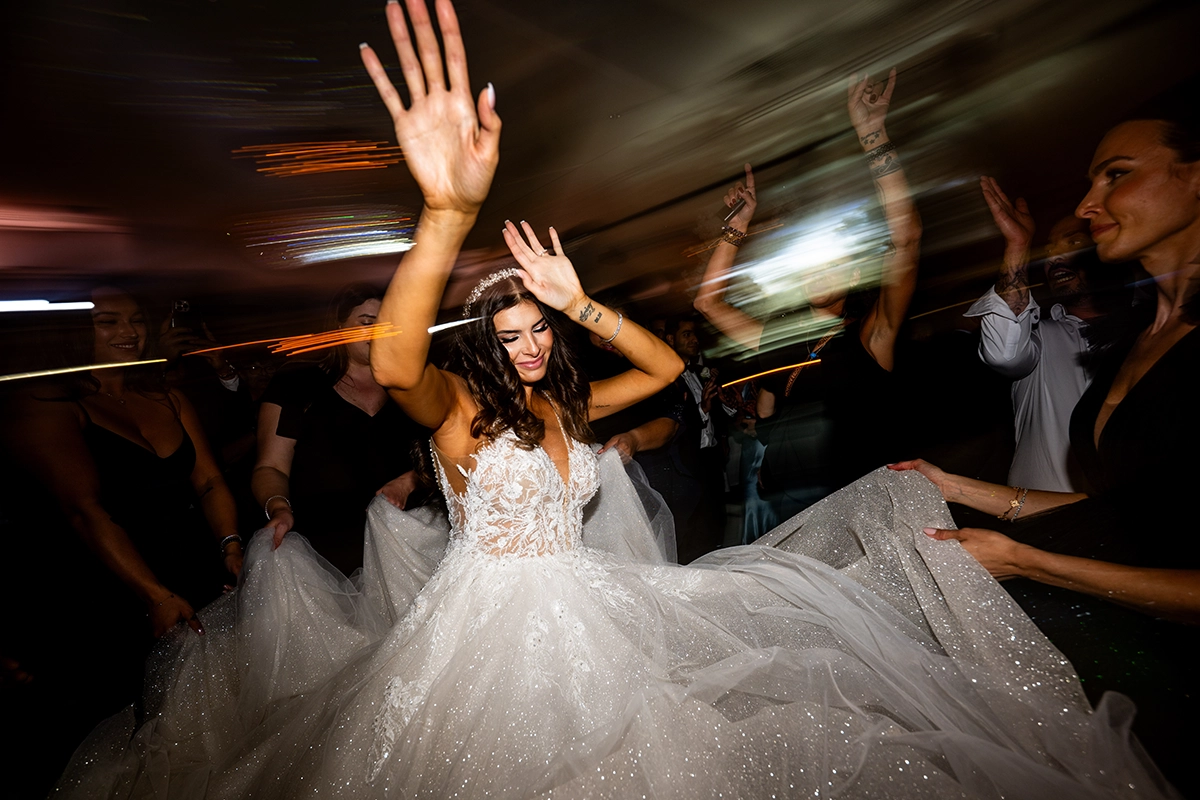 Il y a des moments, lors d'un mariage, où, en tant que photographe, je n'ai aucun contrôle sur ce qui va se passer. La fête va-t-elle devenir endiablée ? Ou restera-t-elle calme et tranquille ? Une chose est sûre : il faut être prêt à tout. Quand la fête commence, elle commence vraiment ! C'est pourquoi il est essentiel d'avoir un objectif grand angle. Il me permet de capturer l'énergie de la foule tout en gardant les mariés au centre de l'attention.