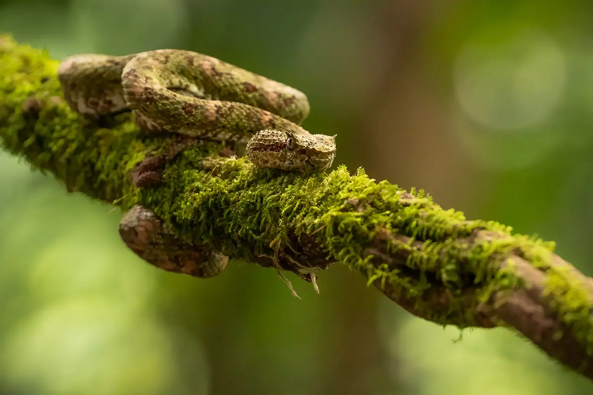 Les deux vipères à cils que vous voyez ici, ainsi que la grenouille de verre, étaient en captivité ; la chenille velue et la rainette aux yeux rouges étaient dans la nature. Ces vipères sont donc observées dans des mises en scène soigneusement manipulées. Pour vous donner une idée de la rapidité avec laquelle elles peuvent frapper, leur principale proie est le colibri, qui se déplace très rapidement.
