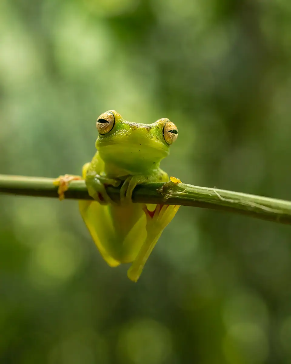 Une partie de la puissance de l'objectif Tamron 50-400mm VC réside dans la possibilité de zoomer et de faire ressortir tous les détails de vos sujets, même les plus petits. Cette grenouille de verre, qui ne mesure qu'un pouce et demi de long, s'est frayé un chemin le long de la branche et s'est retrouvée à un endroit où elle ne voulait pas être. Elle s'est donc retournée pour se retirer, ce qui a fait tomber son arrière-train en partie de la branche. On ne le voit pas ici, mais l'herpétologiste avec lequel je travaillais avait tendu les mains hors du cadre pour attraper la grenouille au cas où elle ne parviendrait pas à s'accrocher.