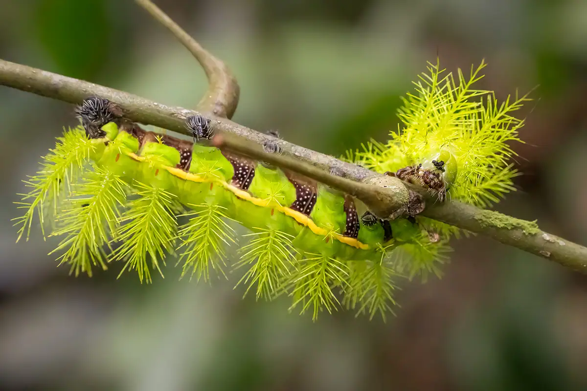 Il s'agit de travailler les angles pour prendre une photo comme celle-ci. Si vous regardez l'image de près, vous verrez qu'il y a en fait une deuxième branche qui vient vers l'observateur. J'ai dû m'aligner sur les deux branches pour minimiser cette distraction et garder l'attention sur la chenille. Le fait que la chenille soit l'élément le plus lumineux du cadre n'y est pas étranger. Que je sois au fin fond de la jungle costaricienne ou sous l'eau lors d'une de mes plongées, je trouve toujours des créatures étonnantes comme celle-ci, ce qui m'amène à m'interroger sur la façon dont elles sont apparues au cours de l'évolution : Comment cette créature est-elle apparue dans la chaîne de l'évolution ? Qu'est-ce qui lui a fait décider que c'était la voie à suivre ?