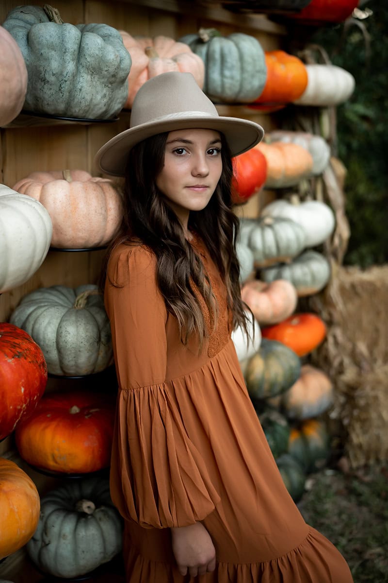 Veillez simplement à ne pas éclipser vos sujets - les accessoires doivent les accompagner en toute discrétion. Ma fille décorait sa chambre pour l'automne et voulait que quelques photos fassent partie du décor. La femme qui dirige la ferme avait construit un mur de citrouilles unique, avec des citrouilles de toutes les couleurs : orange, bien sûr, mais aussi blanc, rose, sarcelle et d'autres couleurs auxquelles on ne s'attendrait pas. C'était la toile de fond parfaite pour placer ma fille. J'ai ouvert mon diaphragme à F2.2 et j'ai gardé ma fille comme point focal.