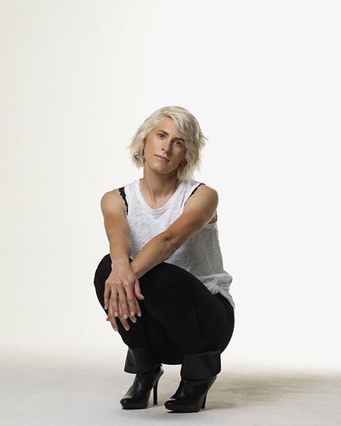 Mise en place 1. C'était notre photo "brise-glace". Je voulais que Scotti soit aussi naturelle et à l'aise que possible. Pour la garde-robe, nous avons choisi quelque chose d'un peu discret afin de laisser ses expressions dominer le portrait. J'ai demandé à Scotti de porter un débardeur blanc fluide et un pantalon de sport noir ajusté. Cela lui a permis de montrer sa forme physique ainsi que sa personnalité. Ses bottes décolletées donnaient à la tenue un attrait de mode.