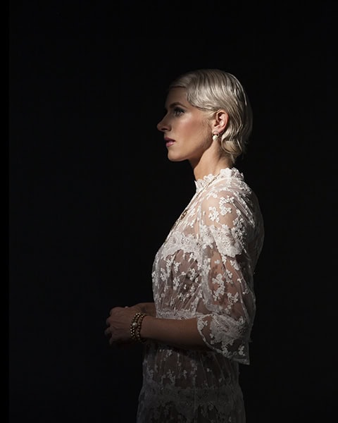 Pour la lumière principale, j'ai utilisé une tête de flash Dynalite avec un beauty dish de 18 pouces, équipé d'une grille et alimenté à travers un réflecteur Westcott Omega. La forme du réflecteur a servi de gobo pour créer l'ombre autour du visage, tout en conservant la luminosité au centre du visage. J'ai également utilisé plusieurs tableaux noirs pour contrôler la chute de la lumière et empêcher la lumière directe d'atteindre la partie inférieure de la robe de Scotti. La lumière principale a été mesurée à F/11, à un mètre du sujet. Comme lumière d'appoint, j'ai utilisé deux parapluies blancs et noirs de 36 pouces, mesurés à F/5 chacun. J'ai varié le contraste tout au long de cette configuration en utilisant une ou deux lumières d'appoint. La lumière d'appoint a été placée à gauche et à droite de mon sujet pour créer une lumière d'appoint ouverte et non directionnelle.