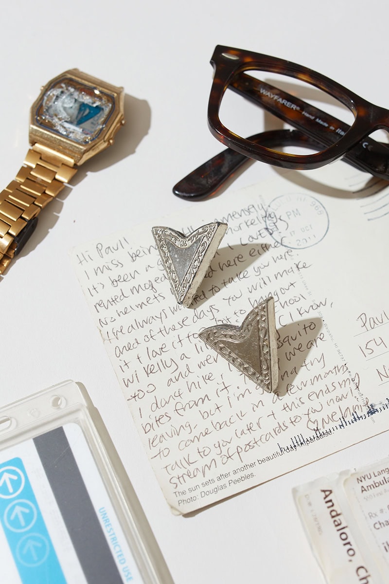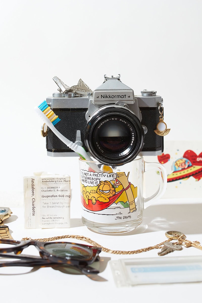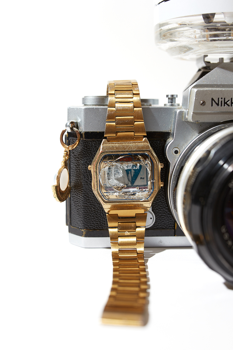Paul a également essayé de trouver différentes façons de photographier ses sujets. "Pour certaines prises de vue, je photographiais directement du haut vers le bas, mais je ne voulais pas toutes les faire comme ça", explique-t-il. "Les faire complètement en grille comme ça faisait très commerce électronique, comme si j'essayais de vendre ces choses sur Instagram. J'ai donc alterné ces images avec d'autres où j'essayais parfois de mettre les objets debout ou de les empiler, comme la montre drapée au-dessus de l'appareil photo. Cela donnait un aspect plus architectural, qui était moins lié à la simple visualisation de ces objets disparates qu'à la façon dont ils interagissaient les uns avec les autres."