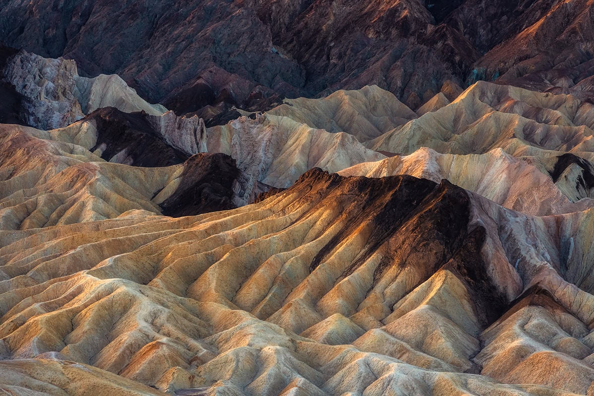 Acceptez les imperfections dans la photographie de paysage et restez à l'affût des motifs, des textures et des formes que d'autres pourraient ignorer. Parfois, le charme réside dans l'irrégularité, qui peut donner du caractère à vos images. Prenez ces tuiles de boue fissurées que j'ai photographiées dans le parc national de la Vallée de la mort. J'ai aimé le fait qu'elles soient toutes de tailles différentes, comme un puzzle qui s'emboîte, et qu'elles donnent l'impression d'être désordonnées sur les bords. Tout ne doit pas nécessairement être symétrique et impeccable.