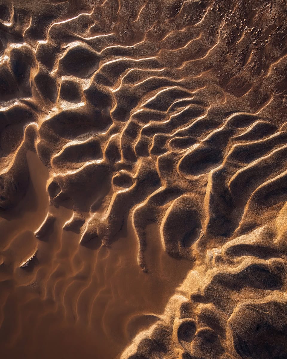 Vous pouvez également créer des images qui ressemblent à quelque chose de beaucoup plus grand et de plus noble, ou qui sont plus fantastiques. La photo que vous voyez ici, qui ressemble à une prise de vue aérienne par drone de dunes de sable dans un désert lointain, prise à des milliers de pieds dans les airs, est en fait une photo que j'ai prise à environ un pied au-dessus d'une plaque de boue de 30 cm de large sur la plage.