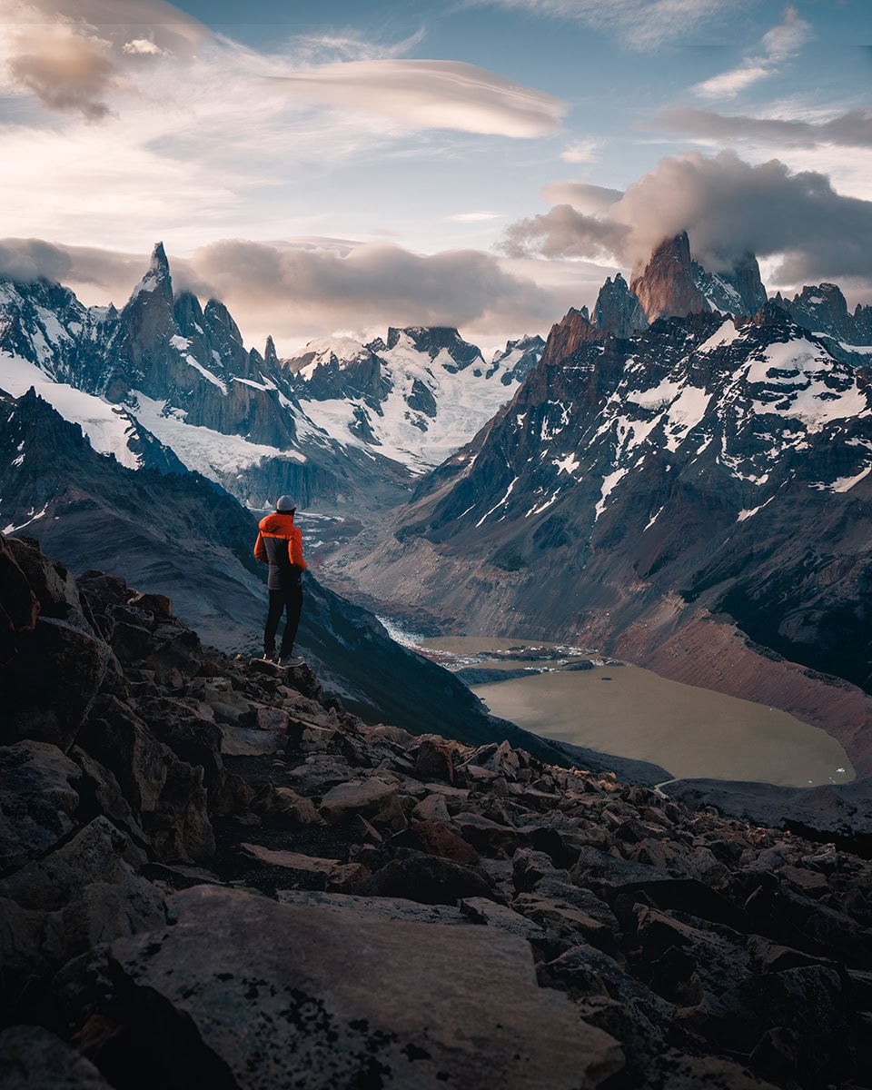 Pour la scène du coucher de soleil montrée ici, surplombant le village argentin d'El Chaltén, mon défi était de trouver comment composer la prise de vue de manière à ce que le monde naturel et le paysage urbain en contrebas soient en harmonie. Je suis arrivé tôt, j'ai donc eu le temps de m'amuser. Je n'ai cessé de repositionner mon trépied jusqu'à ce que je sois satisfait de ce que je voyais dans mon cadre, qui capture l'essence des deux mondes.