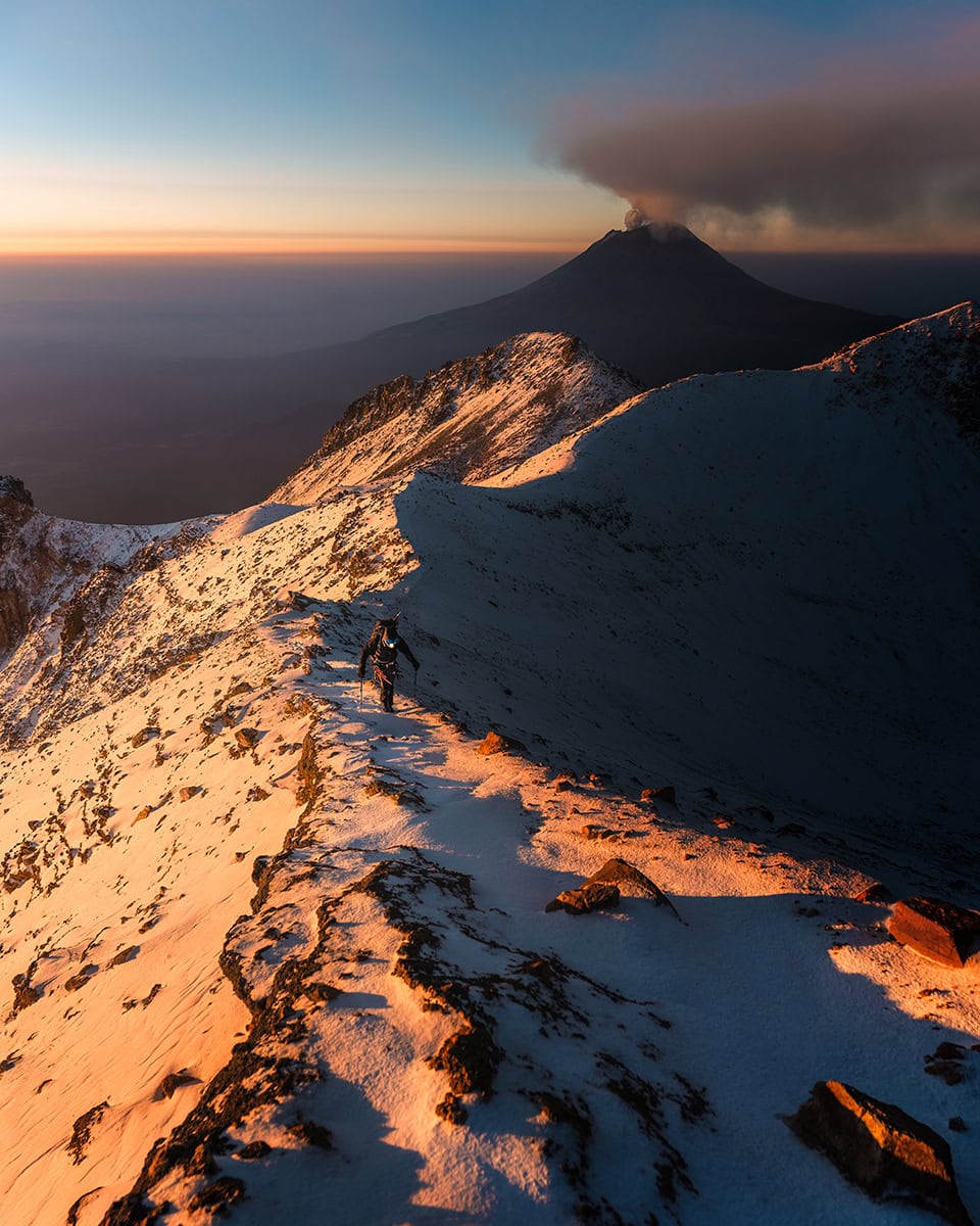 Il est difficile d'égaler les couleurs de l'heure dorée. J'apprécie surtout les levers de soleil, comme lorsque j'ai fait une randonnée matinale le long de l'Iztaccihuatl, un volcan mexicain endormi. Il avait neigé la nuit précédente, et une fine couche de poussière est restée sur place. J'ai voulu jouer avec le grand angle de l'objectif Tamron 20-40 mm pour cette photo et créer des lignes directrices vers mon ami, avec un autre volcan en toile de fond.