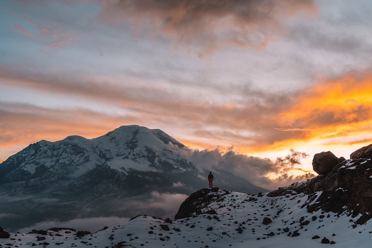 La même chose s'est produite pour ma photo du coucher de soleil au Chimborazo, un autre volcan inactif dans les Andes équatoriennes. Il neigeait lorsque nous avons monté la tente, et alors que nous étions à l'intérieur pour nous abriter, un ami a remarqué que les couleurs avaient commencé à infuser dans le ciel. Nous sommes sortis en courant et avons pris autant de photos que possible, à la main, sans avoir le temps d'utiliser le trépied. Je devais rester assez stable, car il faisait déjà sombre.