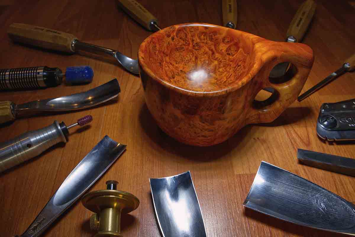 The two images you see here show a sampling of my kuksas, which are Finnish wooden cups. I started making these after the pandemic began to stave off boredom. It’s been very therapeutic for me. If I’m not interrupted, I can make about one a day.