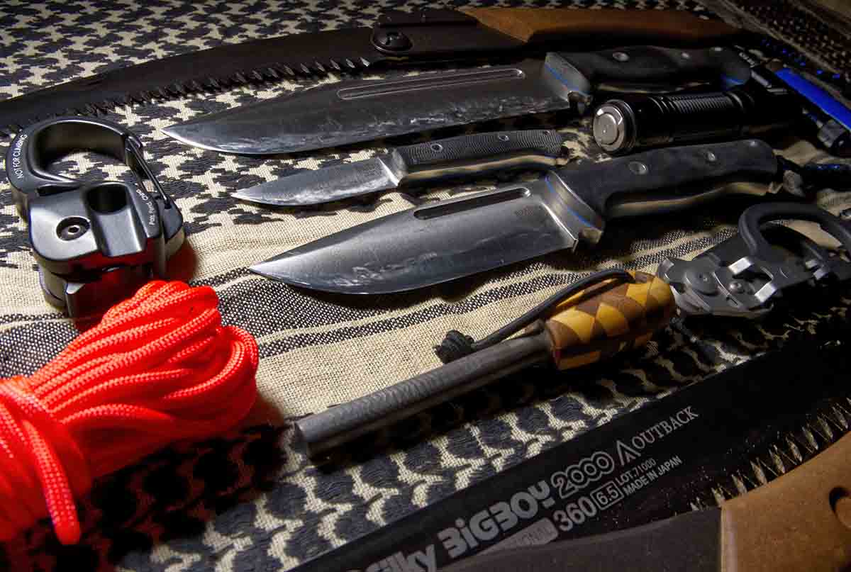These are all the knives and tools I bring when I go camping or hiking. If a tree falls in the middle of the trail, I like being the person with all the good gear who can clear the path for everyone. The friend I usually go camping with and I like to do these types of arrangement shots, where you can clearly see all of the various implements in our equipment bag. The bright red cord here adds a bit of color to the photo. It’s important when we’re in the woods, too. You can’t see black cord in the dark when you’re camping.