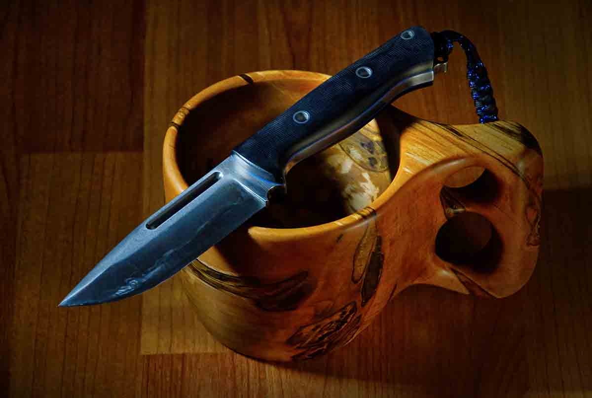 The first photo is the very first kuksa I made. The gouges and chisels you see circled around it are the tools I use to carve the kuksa. For both pictures, I shot the kuksa on my basement floor. For the first image, I used a single overhead video light positioned over the kuksa. This helped isolate the kuksa and create a vignetting around the tools. For the second image, I used two lights. One was a video light off to the left, raised about 7 or 8 inches off the ground. To the right, I had a lantern at ground level to fill in the shadows that the video light was casting.