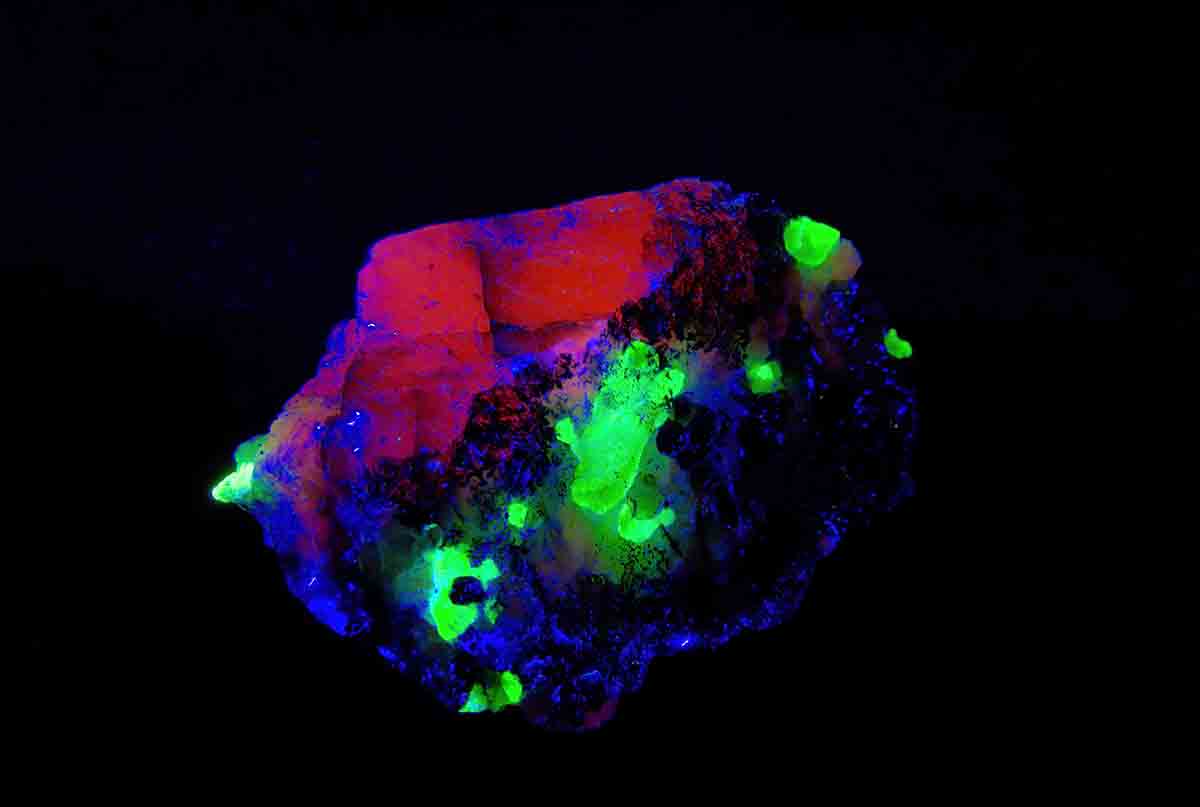 If you look at this rock under normal lighting, you won’t see anything interesting—it will just look gray and slightly metallic. But if you shine a UV light on it, as I did here, you achieve this effect. I placed the rock on top of my son’s black mousepad, because I wanted a surface that didn’t reflect the light back, and because I wanted a color that would isolate the rock. This image is actually a composite of two shots. I couldn’t get everything in one picture because the lens was so close to the rock. I took the first shot with the UV light shining on the rock from the top left, then a second shot with the light coming in from the bottom.