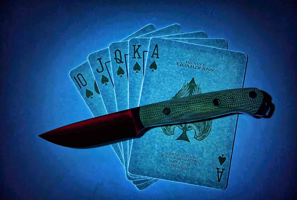 For this image I used a UV flashlight to illuminate this scene from the top. The edges of the cards are glowing, more so than the cards’ surface, and there’s a faint red glow on the knife plate itself. I didn’t anticipate that last part, but that’s apparently what happens when light from a UV flashlight reflects off of metal and other similar surfaces. Most cameras have a UV/infrared block filter, and that filter affects the UV light that emits from the flashlight so that it appears red.