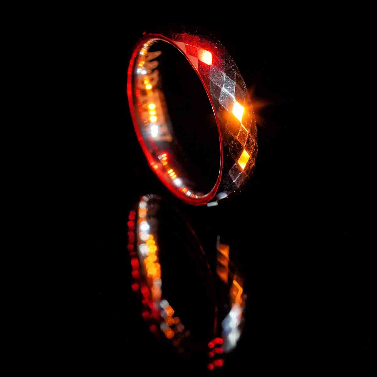 This is my wife’s gift ring for our 10th anniversary. When I was shooting weddings, I had a technique where I’d place the wedding bands on the glossy surface of a piano, if the venue had one, and take photos of the rings there. Then I started bringing my iPad to the event and placing the wedding bands on top of that instead—a much more practical solution than searching for a piano in every venue. That’s what I did here, setting my camera up on a tripod right next to the iPad. I used three different lights—a red, a yellow, and a white—to get the colored reflections I wanted in the ring.