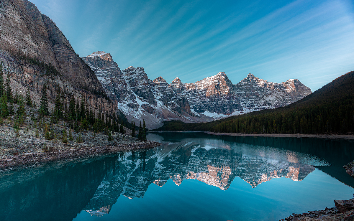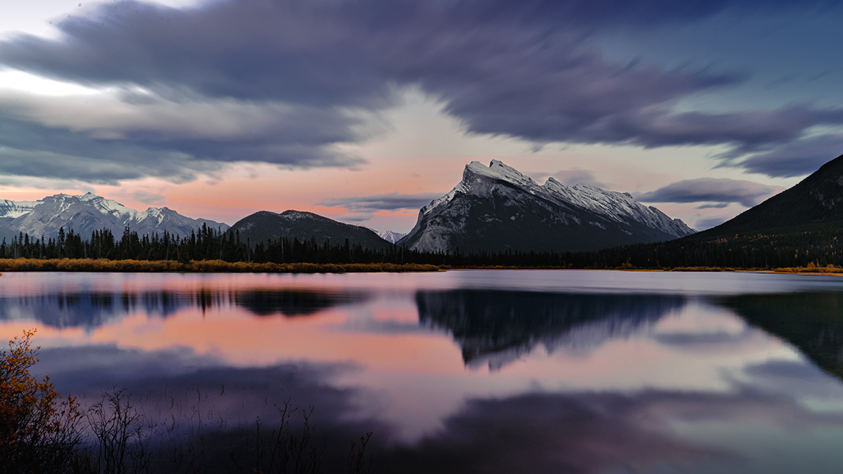 I was scouting in Alberta around dusk when I spotted this lake scene, with the mountains in the background. I slammed on the brakes, scaring my wife, who thought I was screeching to a halt to avoid hitting an animal. I quickly mounted my camera on my tripod, created a composition, and then noticed that the clouds were moving pretty fast. I pulled back my exposure to 30 seconds, threw on a polarizer, and gamed it for those clouds. This image is actually a composite of three different images. I exposed for the water and clouds in one, then the mountains and background for the other two.