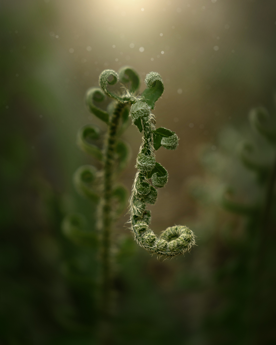I also try to place my main focal point on an intersection of a classic compositional flower photography technique, such as the rule of thirds, golden ratio, or even center composition. For the curled fern shown here, I wanted the focus to be on the beautiful curl, but the light was flat, so I used the editing process to shape the light and draw the eye to the fern’s shape.