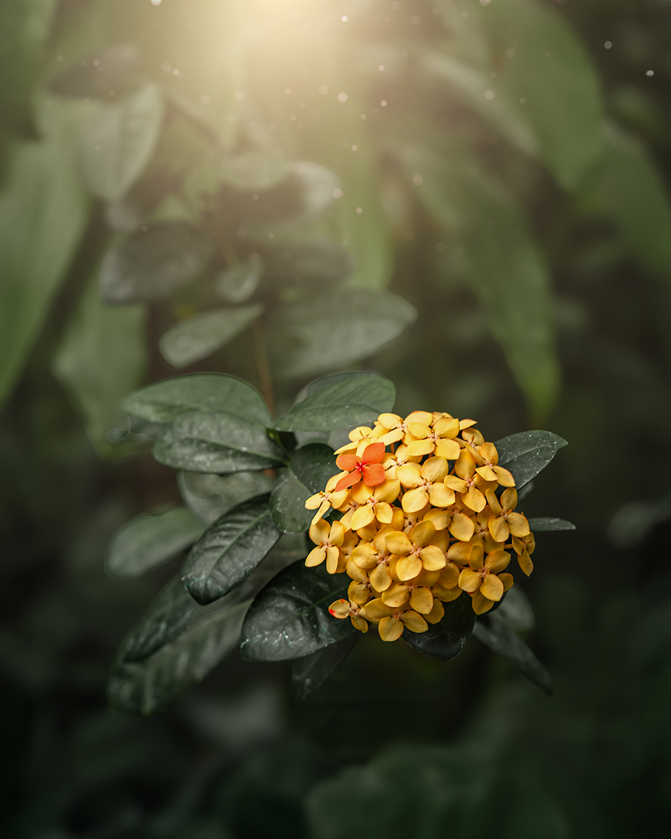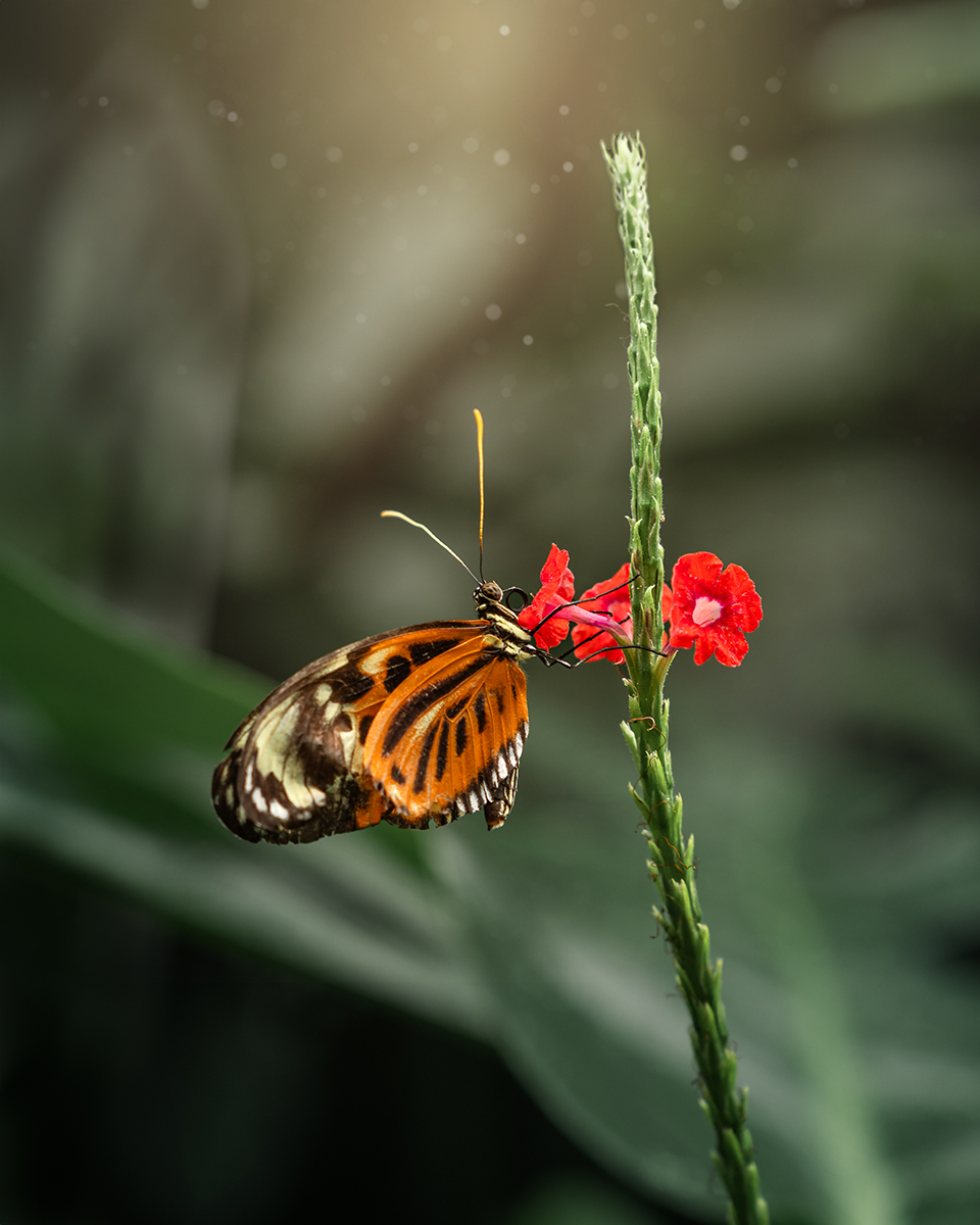Sometimes it’s a bold color, or a texture. Oftentimes, it’s a flaw. Take that yellow cluster of flowers with one orange bloom, which I stumbled upon inside a butterfly greenhouse. It was tucked off in the corner, but that one orange blossom among the yellow stood out to me. I cropped in a little closer and added some directional light in post-processing to highlight this unusual beauty.