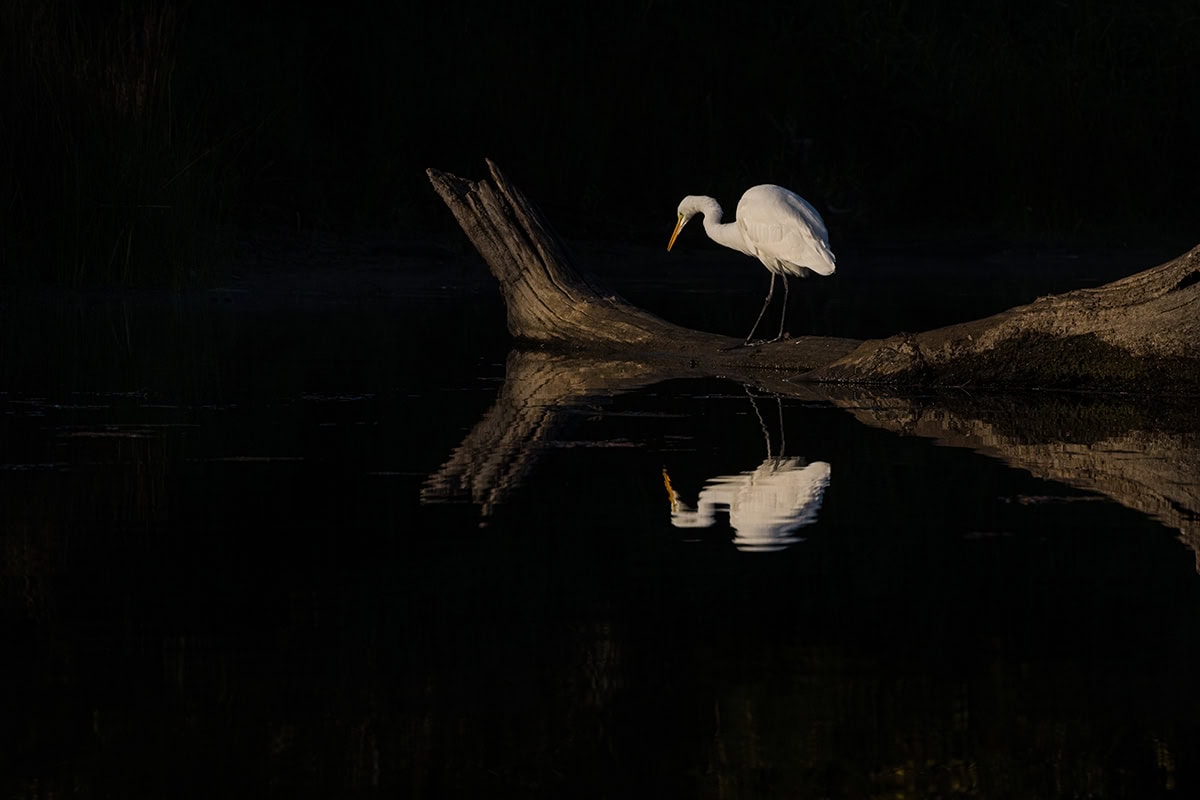 I’ve been photographing the same area every weekend for eight years, so I know where certain lighting situations are going to happen. This bird was originally in more of a backlit area with lots of fog around it, and when it took off and started to fly, I had a feeling it was going to land on this log, which it did. I simply did a 180 in my kayak so I could photograph this scene, where the lighting was so different. This is one of my favorite types of scenarios—on the edge of light, where the subject is lit up and everything else falls into solid black shadow.