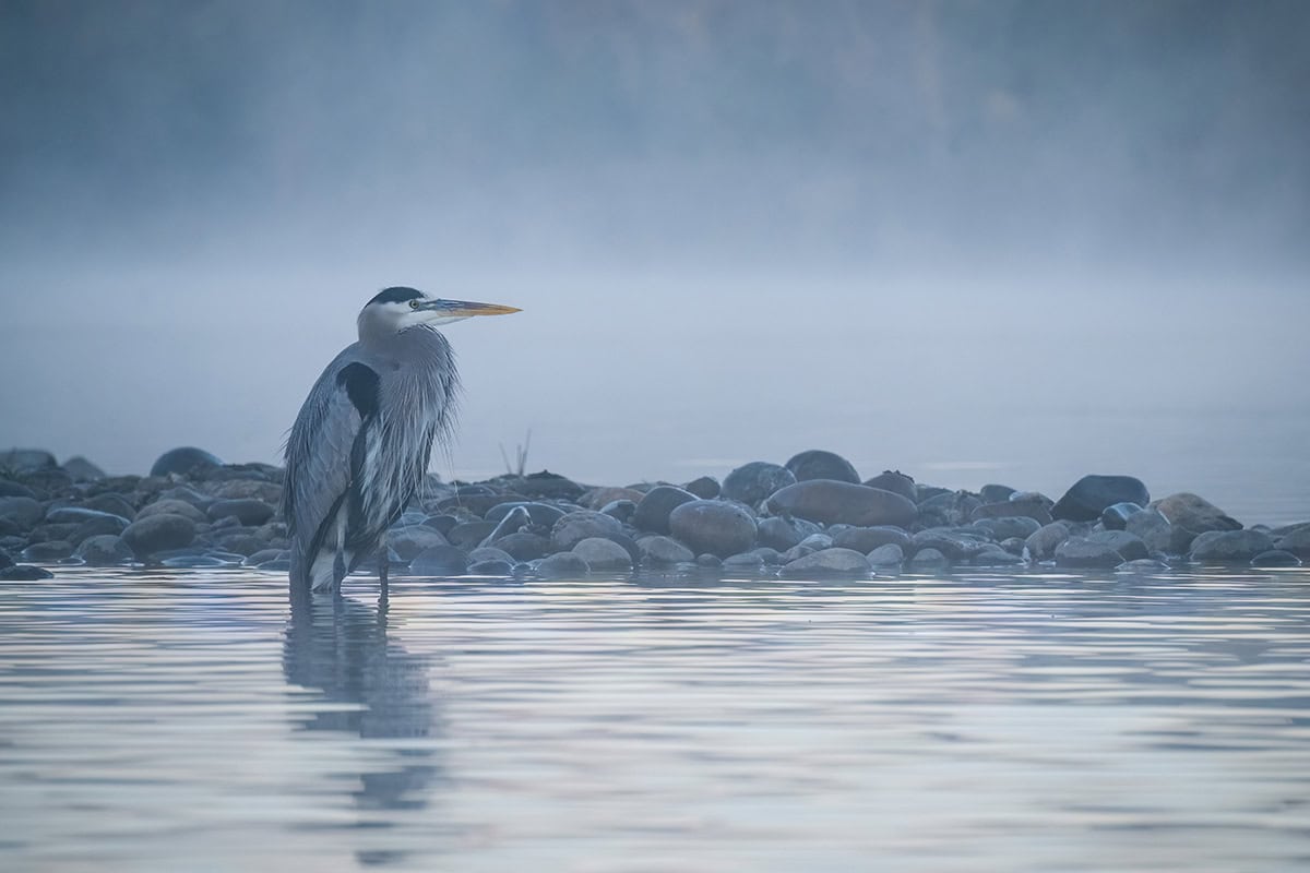Winter is my favorite time of year to kayak, because I’ll often encounter these misty or foggy mornings. A friend and I went out together on this particular day. It was a gorgeous scene, with that monochromatic vibe and the mist rising off the water and an overall mood. Plus, as I mentioned, I love a good profile when it comes to birds. I captured this image, and when I posted it on Facebook, someone wrote to me to tell me that a painting she’d completed looked just like my photo.