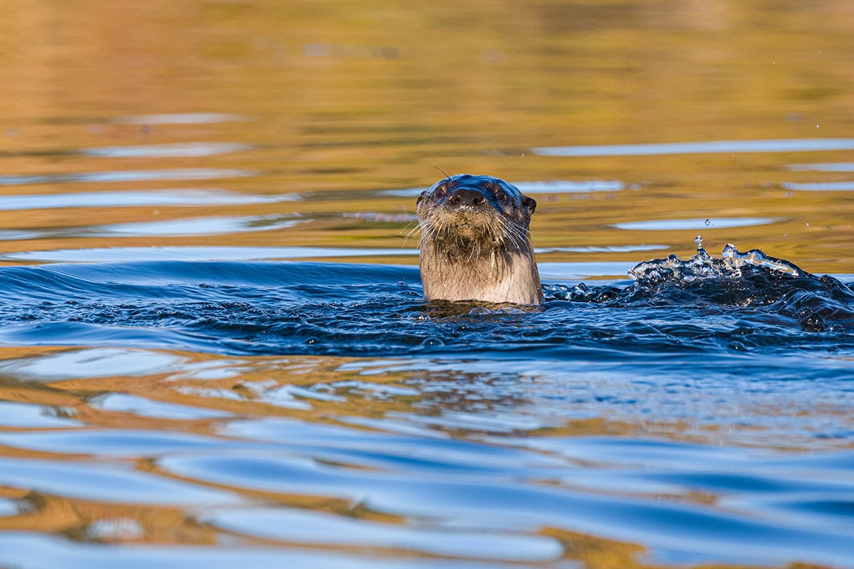 We were keeping our distance from the river otters that day, making huffing noises to get them to look over at us. For most of the time we were near them, they were swimming around in an area that didn’t have a lot of light; it wasn’t worth taking a picture. Then, finally, they swam to a better-lit spot, where all the gold grass and trees were reflected in the water, and the ripple in the water was reflecting the blue of the sky. One of the otters suddenly poked its head up out of the water and stared straight at me. I thanked it for the photo—I always thank the animals when they cooperate.