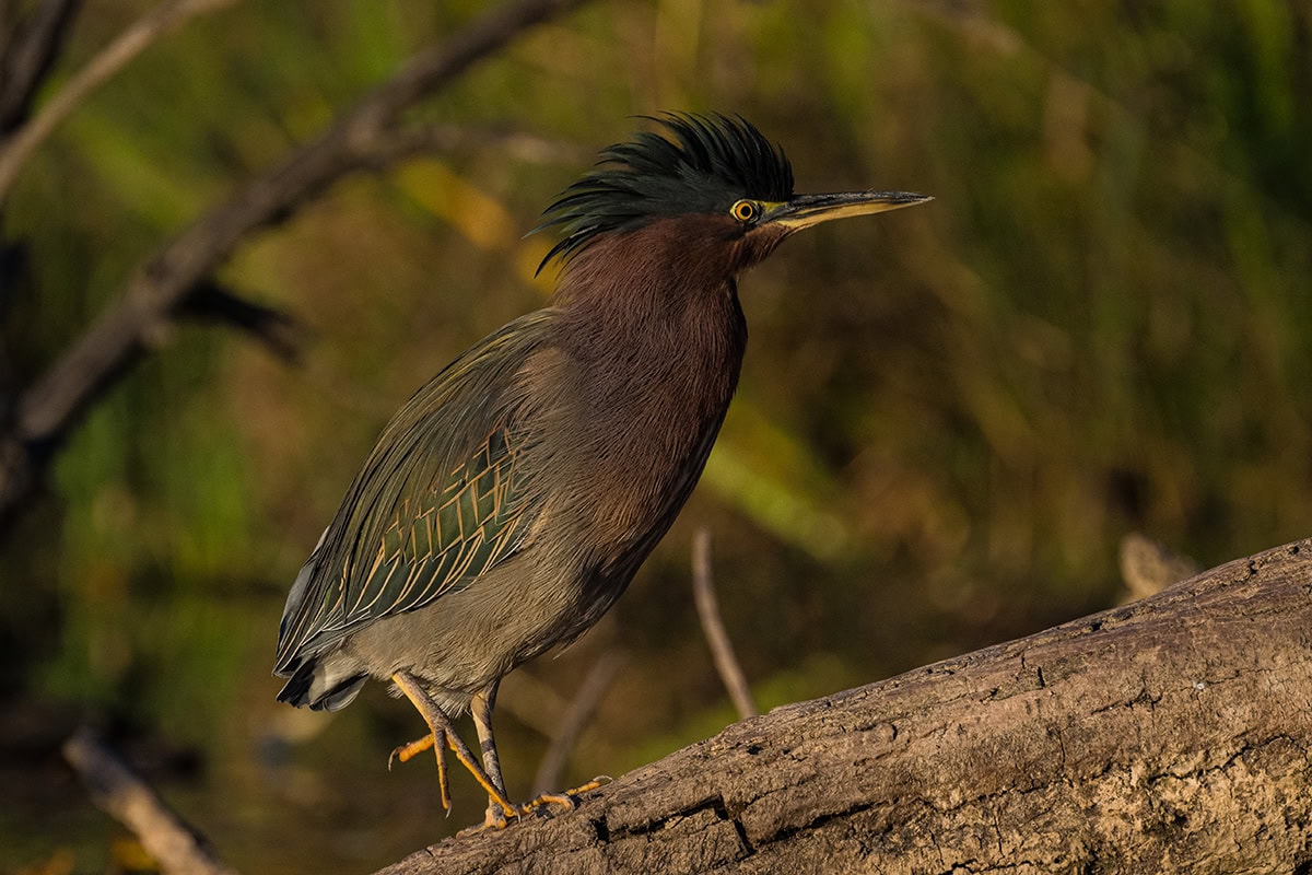 I waited for a while for some kind of movement from this green heron, which finally came when it moved its foot. I also waited until the bird got to a spot where there wasn’t a terribly busy background with lots of sticks and other distractions. I couldn’t get any closer than 15 feet, so being able to zoom all the way in to 300mm was key. I was also able to achieve a fairly shallow depth-of-field. I typically take photos like this at around F/8 or F/10 because I want to make sure that if the bird turns toward me, that its eyes and beak will be sharp. My favorite part of this image, though, is the tufts on the top of its head that are sticking up. A bird’s “bad hair day” is always fun to photograph.