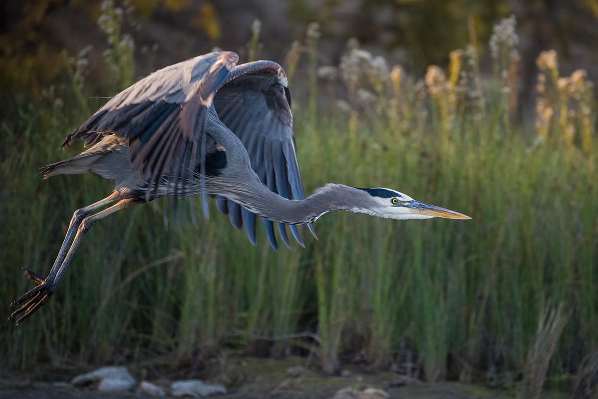 This blue heron had just taken off, so it’s pushing hard. With those first couple of strokes, the heron has to work up a lot of lift to get off its perch or the ground, so there’s a lot of force going on in the wings. I was pretty close to the bird here, so you can see the motion in the closer part of its wings, which are moving up and down. However, the body isn’t going up and down, it’s moving left to right, so I was able to freeze that motion. My favorite part of this image, though, is the light hitting the back of the heron’s legs and feet.