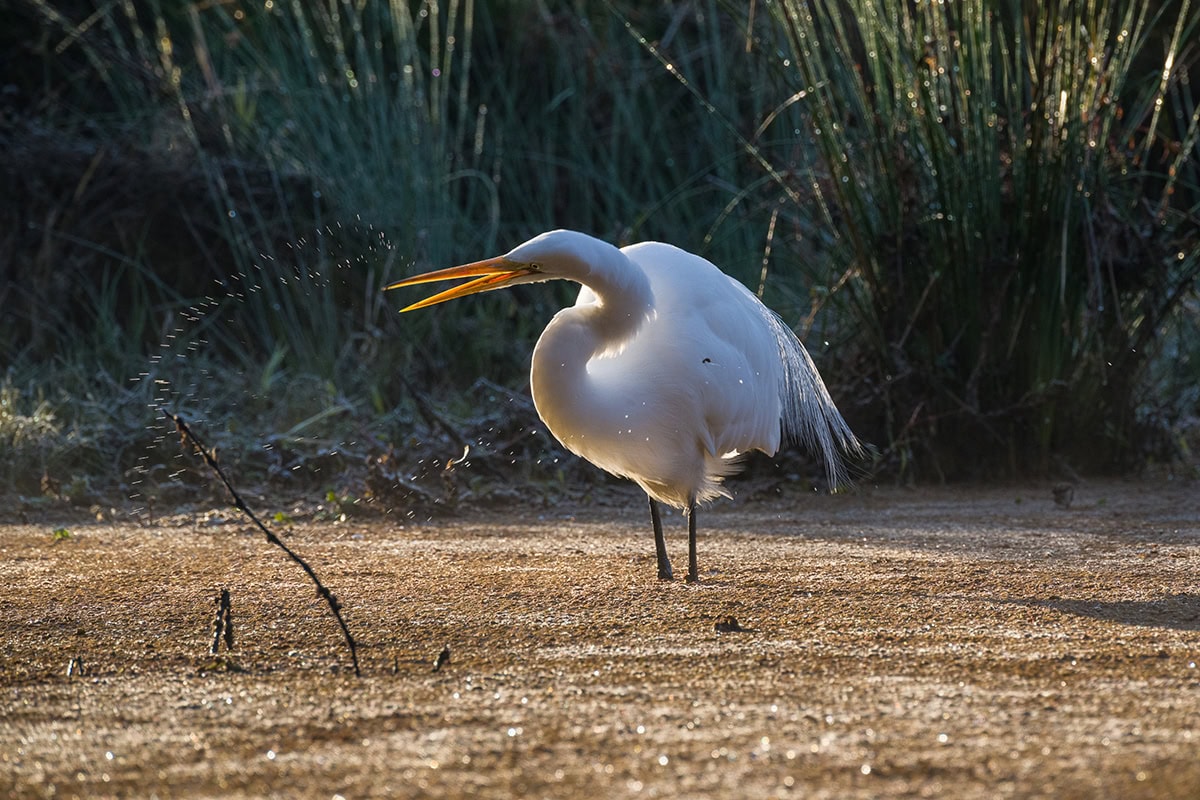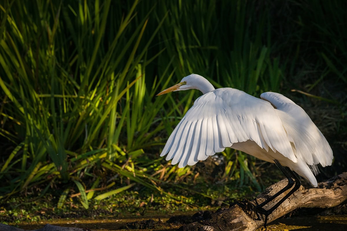Great egrets, which are huge birds, fish along the shore and catch these tiny fish that are maybe an inch or two big. I’m not even sure how they muster up enough energy from these little fish to go out and catch some more. They’ll sit there staring at the water for 20 minutes, then dive in for one tiny fish. This one had just landed on that log and was gazing into the pool below to see if there was a meal there. It was the perfect photo opp, as the bird had come from a shady, busy, ugly area to this simpler background, with that nice warm glow on its wings.