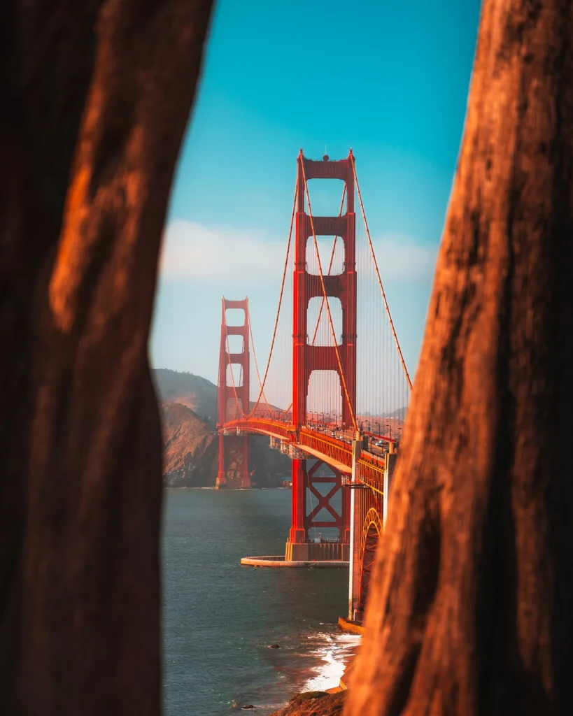 For my photo here of the Golden Gate Bridge, I stumbled upon this spot during an afternoon walk near the bridge. Even though I’d seen pictures of the bridge from that angle many times before, I wasn’t aware that spot was on my path that day. I loved how the two trees naturally framed the bridge, creating a balanced composition with my own twist. The weather was also on my side that day—a cloudy blue sky provided the perfect backdrop, making the bridge’s bold red color pop even more.