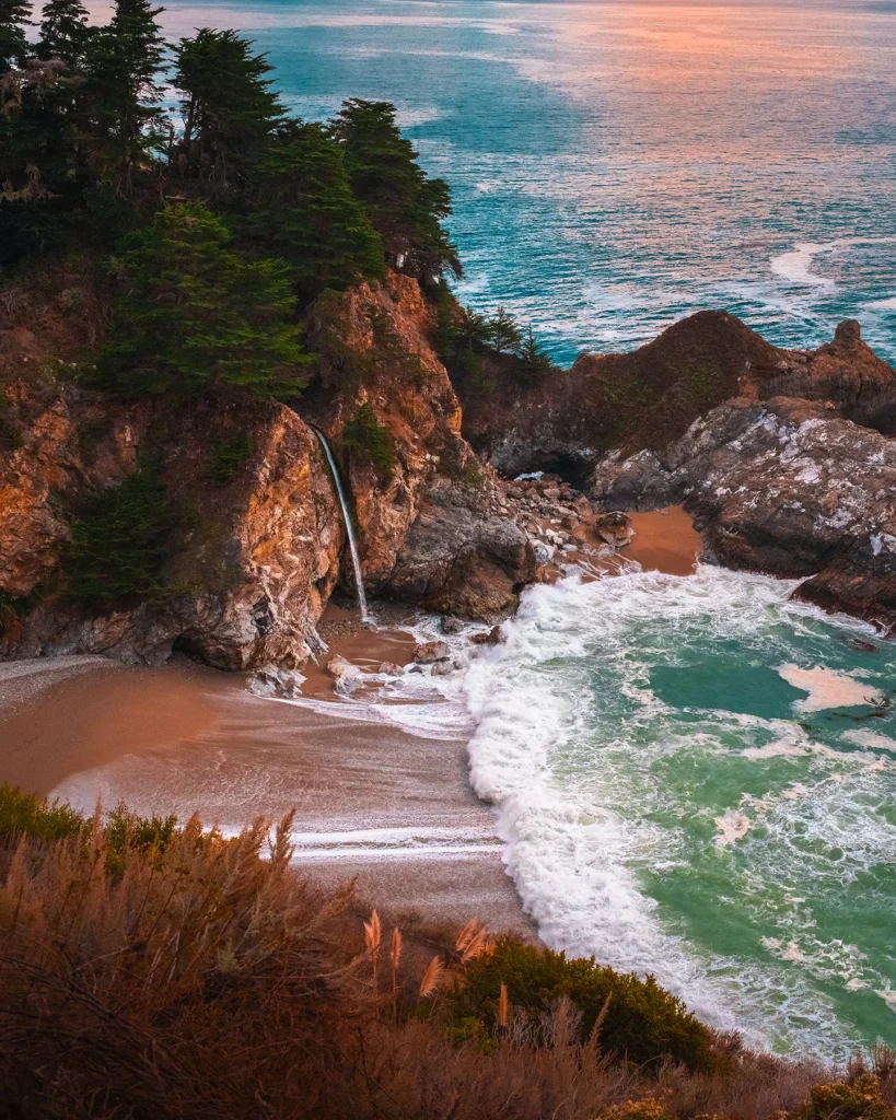 This shot at McWay Falls, an 80-foot waterfall along the coast of California’s Big Sur, took six hours in total. When I arrived that morning and saw the falls, I immediately envisioned the composition, using the rule of thirds to place the waterfall on the left and the waves crashing on the right. However, the overcast sky muted the scene’s colors, making it feel flat. I ended up making three trips back to the falls throughout the day, waiting for the right conditions. Eventually, I got the moment I was hoping for—the blue sky reflecting on the ocean, and the warm orange hues of the sunset glowing on the water.