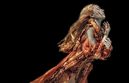 Michael paired a kimono to match Andrea’s golden-red hair color and explained to her before the shoot (it’s difficult to communicate while she’s in the pool) what he was looking to do. “Water makes everything move, so I wanted to create a very classical, angelic photo,” he says. “I wanted it to look like an old Renaissance painting. I posed my own hands to show her what I was looking for, telling her I wanted her hands close to her body and everything on the same plane.”