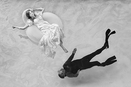 The answer to the first question was yes, the second no, so Michael improvised. He placed the decked-out bride in a green float in the middle of a pool and had an assistant in a black wetsuit push her around in the water, as Michael perched high up on a ladder above them with his Tamron SP 24-70mm F/2.8 VC. “The float was green, like a greenscreen, and the guy’s wetsuit was black—meaning it was going to be easy to take them out of the final photo with a couple of clicks in post-processing,” he says. “And that’s what we did for the final image, which is the one she wound up buying: It just showed her floating in her dress in the pool.”