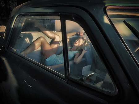 Reliving the days when he used to frequent drive-in movie theaters was the inspiration behind another recent photo with the 45mm. “I love old vintage cars, and I have a whole series of pictures spurred by those memories of why we went to drive-in theaters, including this one of a woman lounging in the back seat,” he says. He captured this photo in a friend’s garage in Hawaii. “There was just one sliver of sunlight coming in from the window, late in the day,” he adds. “There was no other way I could’ve gotten that look without that one perfect shaft of light.”