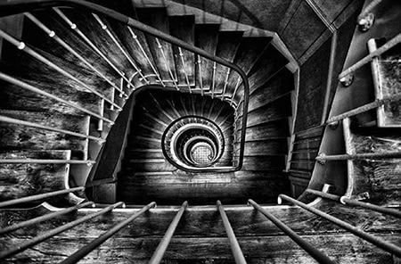 From spending so much time in Paris, where his second studio is located, Michael has become familiar with a ubiquitous architectural trait there: the spiral staircase. “There are probably more spiral staircases per square inch in Paris than anywhere else on the planet,” he says. “Whenever I get into one, I first shoot up into the staircase, then I climb up to the top and shoot down.”