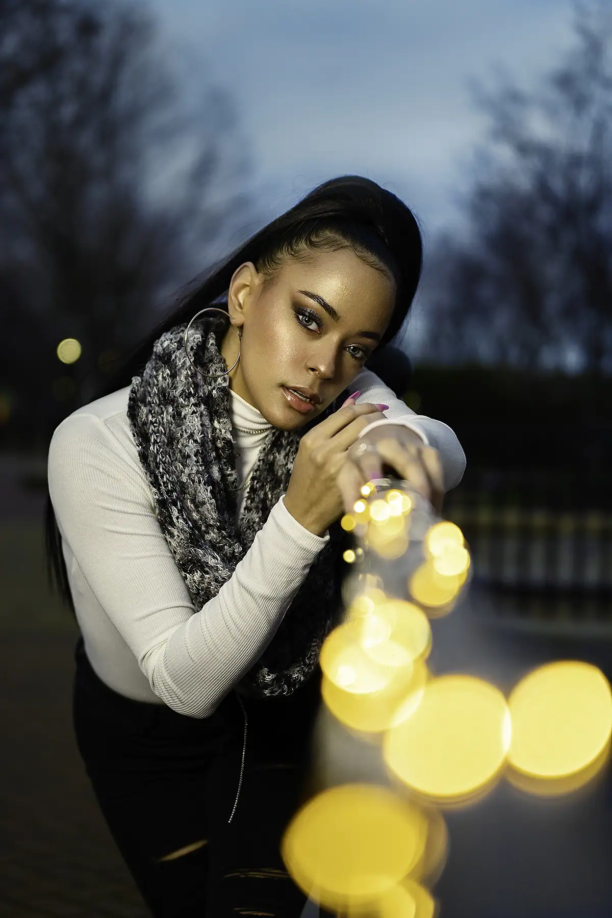 The 70-180mm F2.8, meanwhile, is the ideal complement to Diego’s 28-75mm F2.8. “I also love the bokeh I can achieve with this lens,” he says. “I wanted to highlight that with the image you see here of the model pointing at the camera, where I used string lights to create a leading line from the camera to her. We wrapped the lights around a railing we found on the street, positioning them in the foreground while the model stood on the other side. One of the biggest challenges in capturing this image was the cold weather—we could only stay outside for about 10 to 15 minutes before needing a break to warm up!”