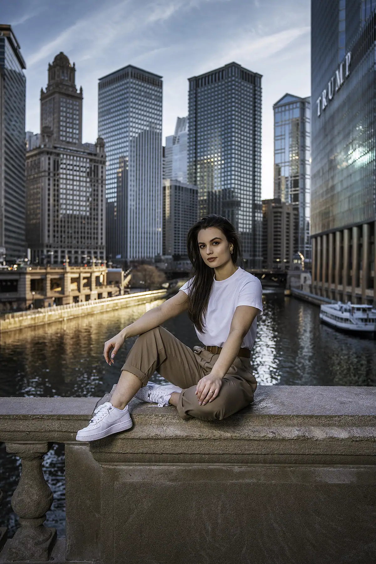 However, make sure your light is balanced. For the photo of the model in Chicago right before sunset, shot with the 28-75mm F2.8 lens, we stumbled upon a great spot where I could frame the model perfectly in the center of the river, with the city skyline as the backdrop. The timing was just right, with the warm tones from the golden hour reflected off of Chicago’s architecture. This created a beautiful contrast with the cooler blue tones from the buildings, resulting in a balanced mix of warmth and coolness in the scene.