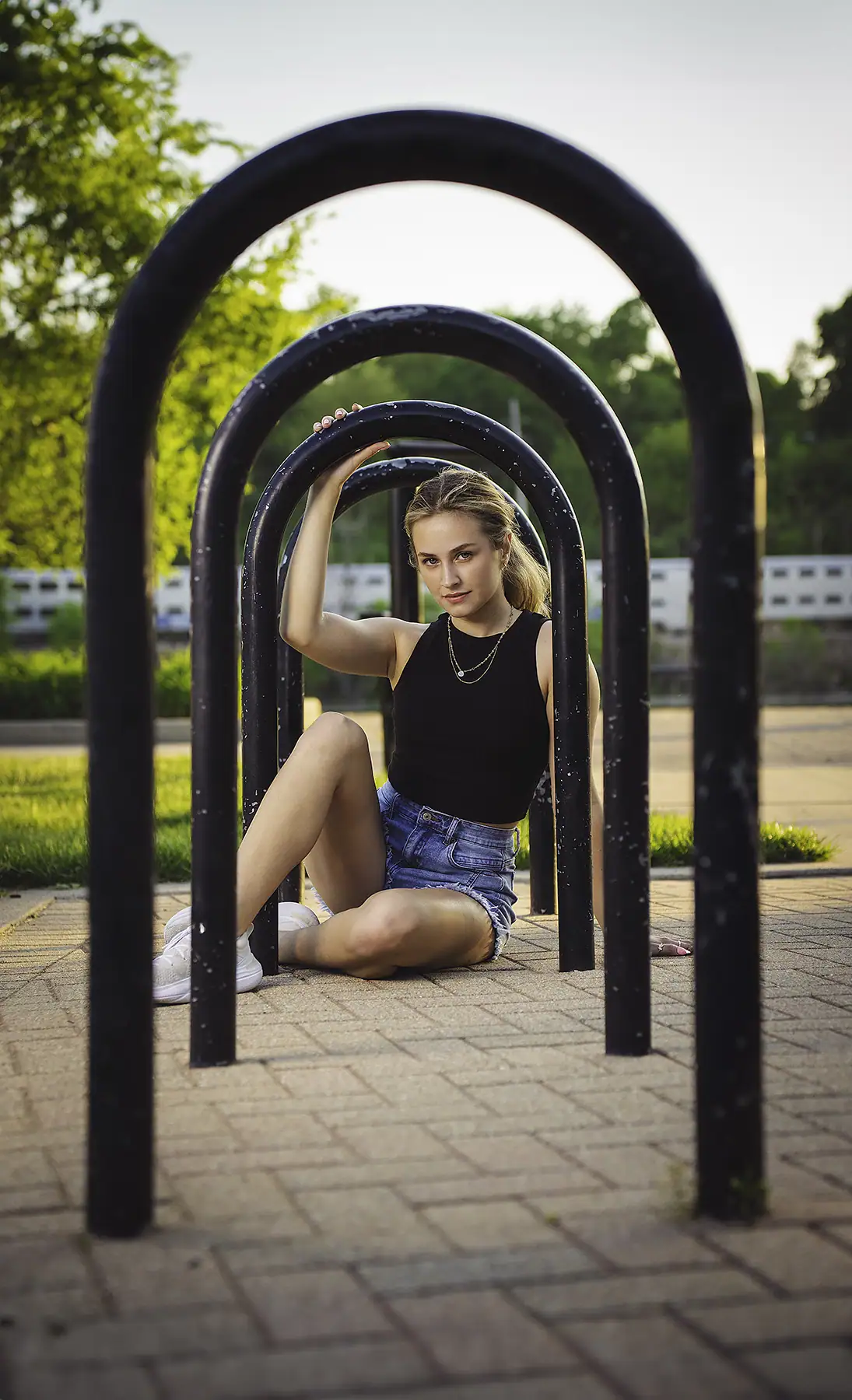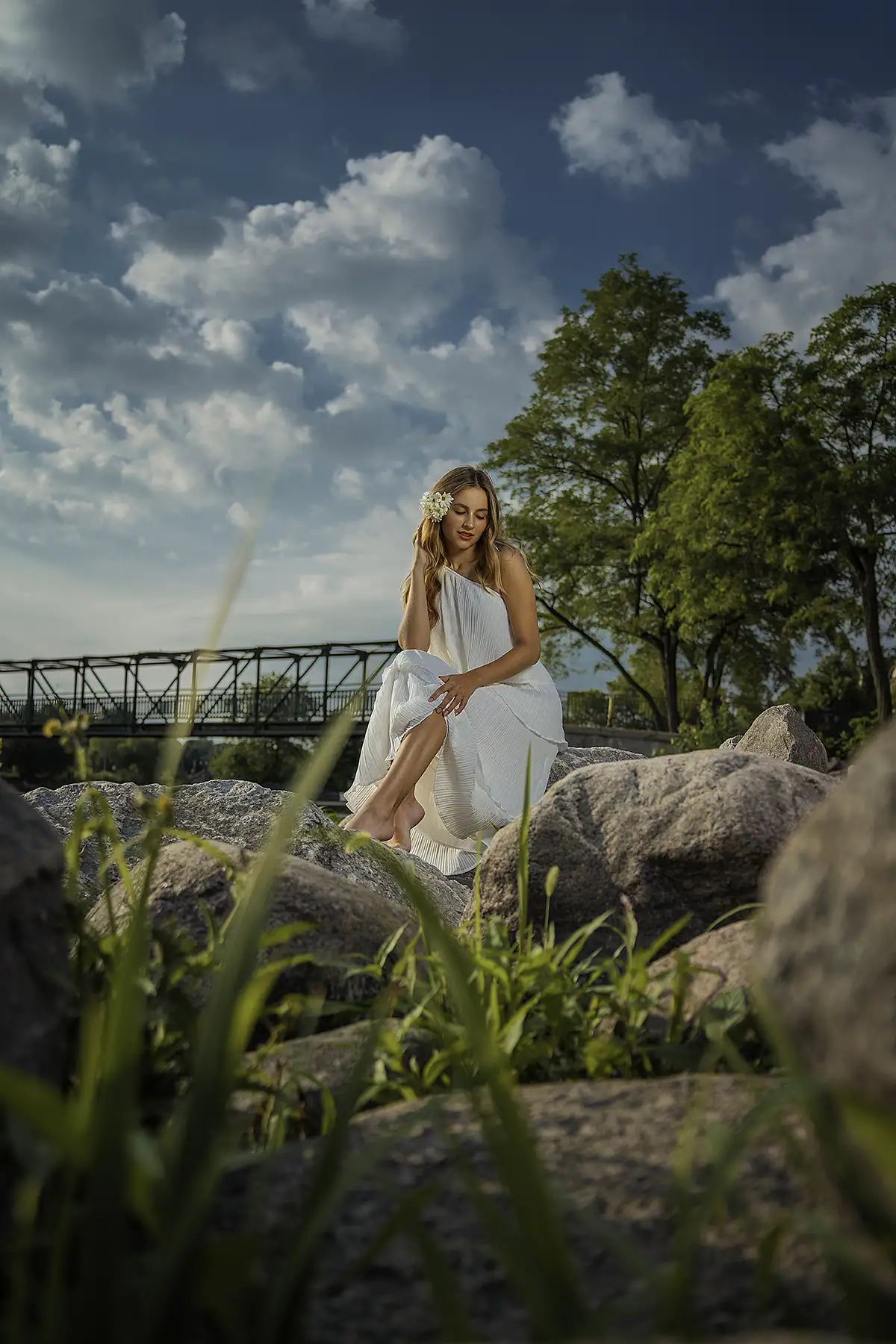 For the woman shown here sitting among the tulips in Chicago, I aimed to create a strong composition by using those tulips as the foreground, with the buildings serving as the background. The 28-75mm F2.8 lens was perfect for this scenario, as it allowed me to frame the model between the tulips, achieving a sense of symmetry and a visually pleasing composition. The same for the photo with the empty bike rack and the model lounging in back of that pile of rocks, which we stumbled upon by the river. The uneven placement of the rocks created an eye-catching composition, allowing me to frame the model between the rocks and grass.