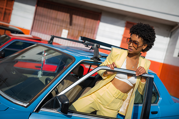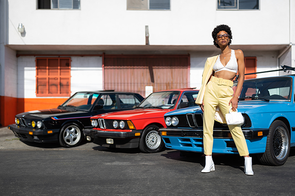 “The model I worked with, Tyler Faye, recommended this spot, an urban flea market in Compton,” Paul says. “It was a very loose, free-flowing shoot, in the parking lot with all of these BMWs. Tyler is a professional who gets hired by multiple modeling agencies, and whom I’ve worked with before, and she’s incredible to collaborate with—she knows all of her angles and is immediately on as soon as she arrives to a session. Between her acumen and the color palette of those cars, everything came together. I let the environment guide me on the content we created.”